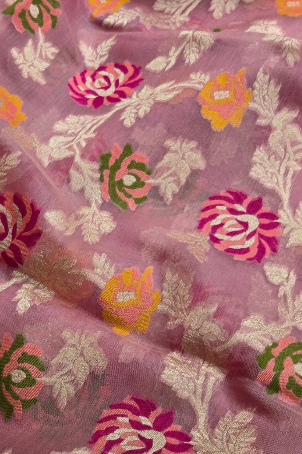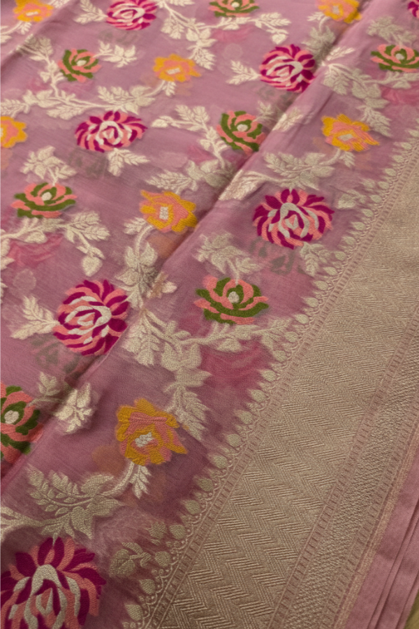 Handwoven in pure Kora Organza by cotton silk using intricate jungla motifs and Tilfi Meena detailing a vibrant expression of House of Dharmani’s timeless craftsmanship.