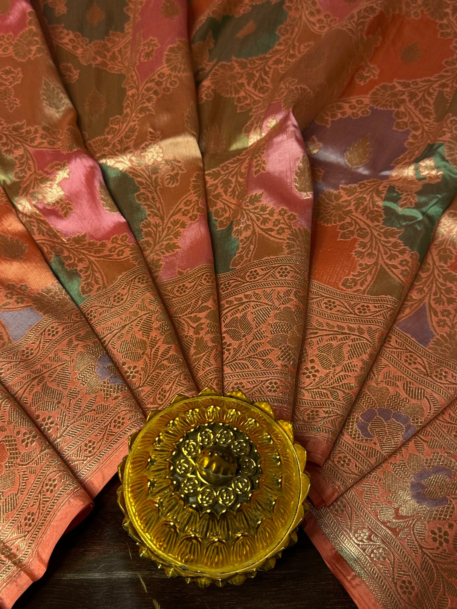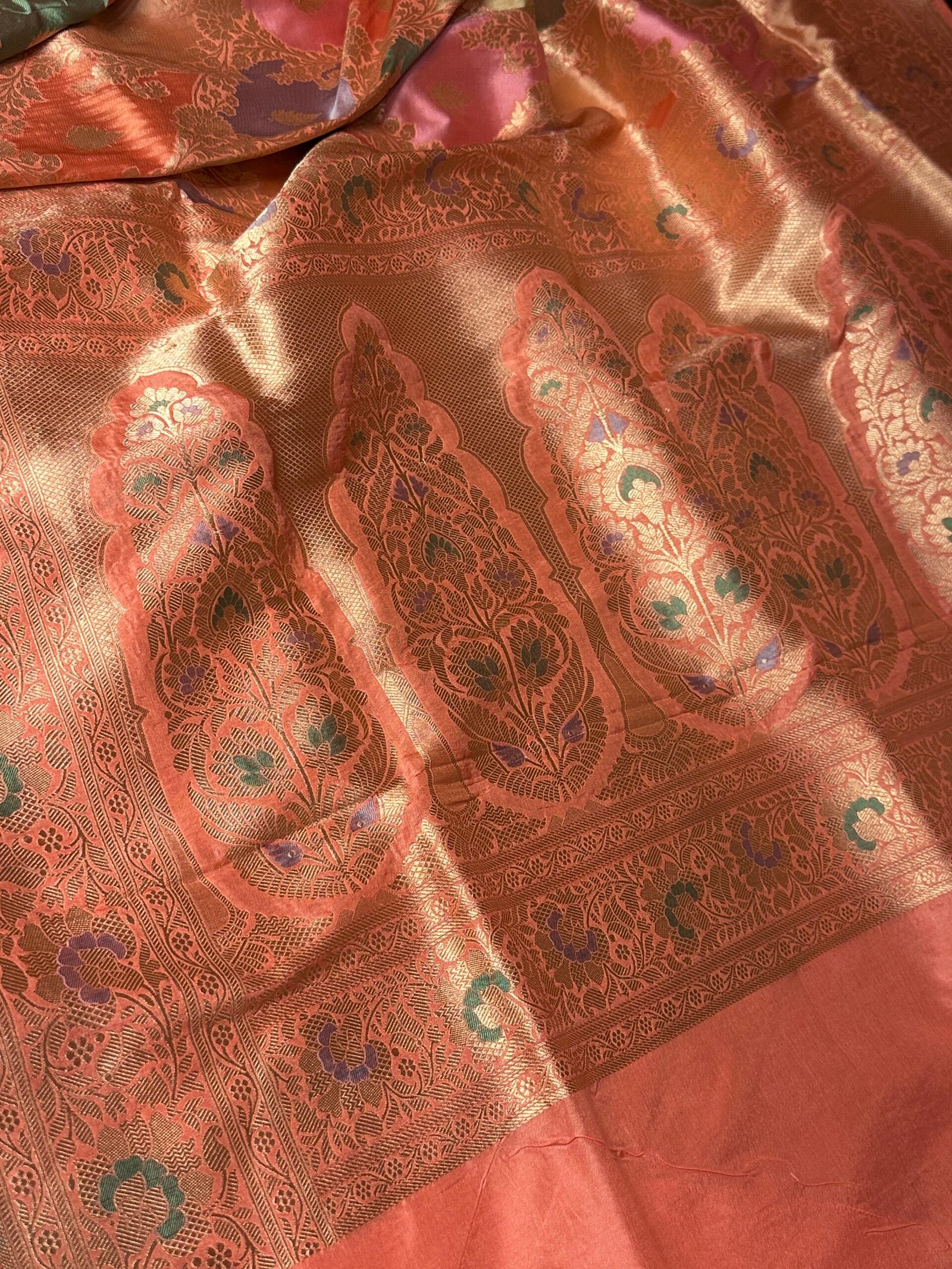 Soft, graceful, and effortlessly elegant, this saree captures the beauty of delicate pastels woven into a refined composition. The gentle peach blush base sets a soothing tone, enhanced by the subtle interplay of multiple hues through the artistry of rangkaat weaving.