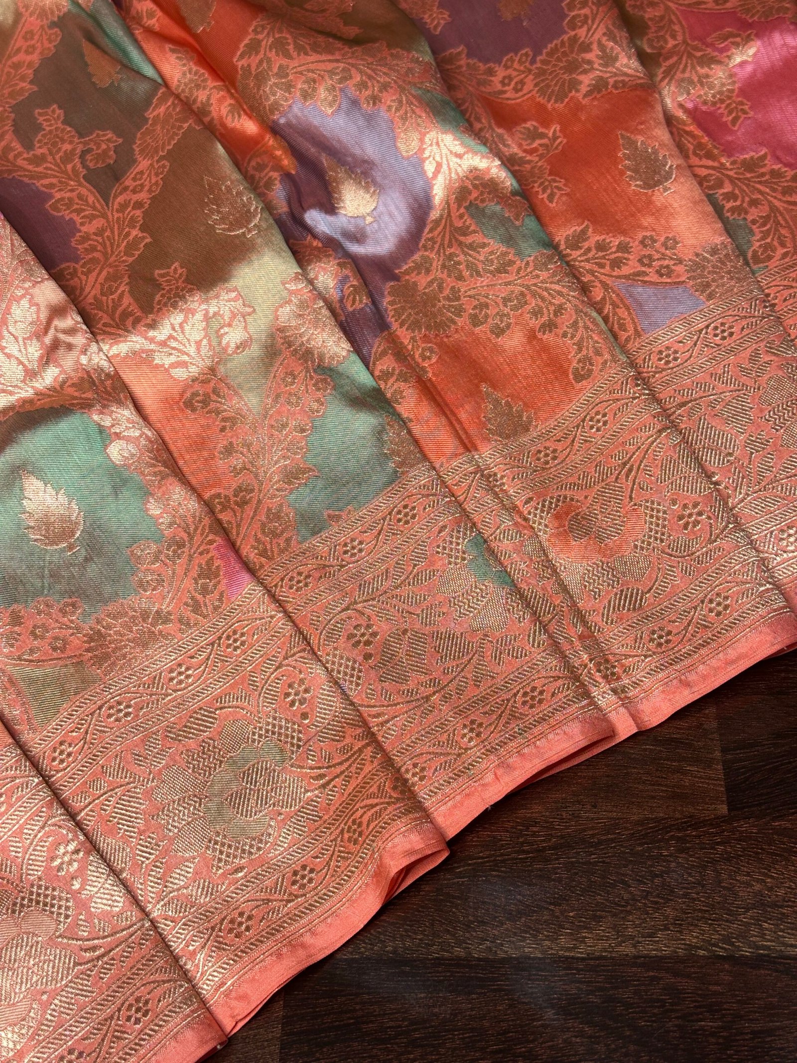 Crafted using the traditional rangkaat technique, the saree showcases a seamless blend of colors that flow into one another with quiet sophistication. Unlike bold contrasts, the tones here remain soft and harmonious, creating a light, airy visual appeal.