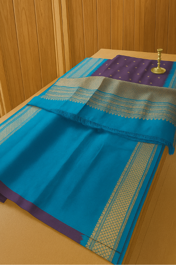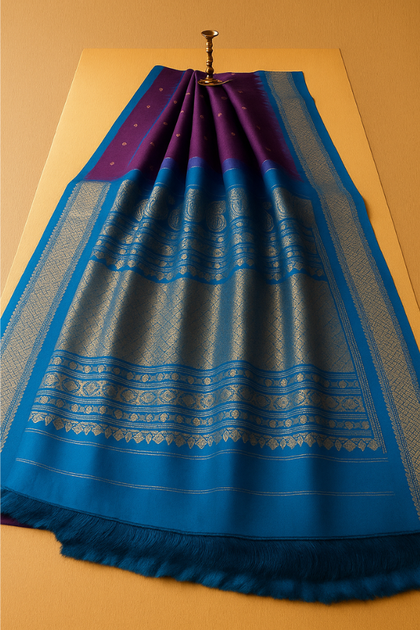 Handwoven with precision, this saree features a radiant zari border and opulent pallu in shimmering antique gold, contrasted with a rich violet-plum body delicately embellished with golden buttas. The vibrant union of jewel tones and intricate weaving reflects the House of Dharmani’s mastery in fusing heritage grandeur with modern elegance.