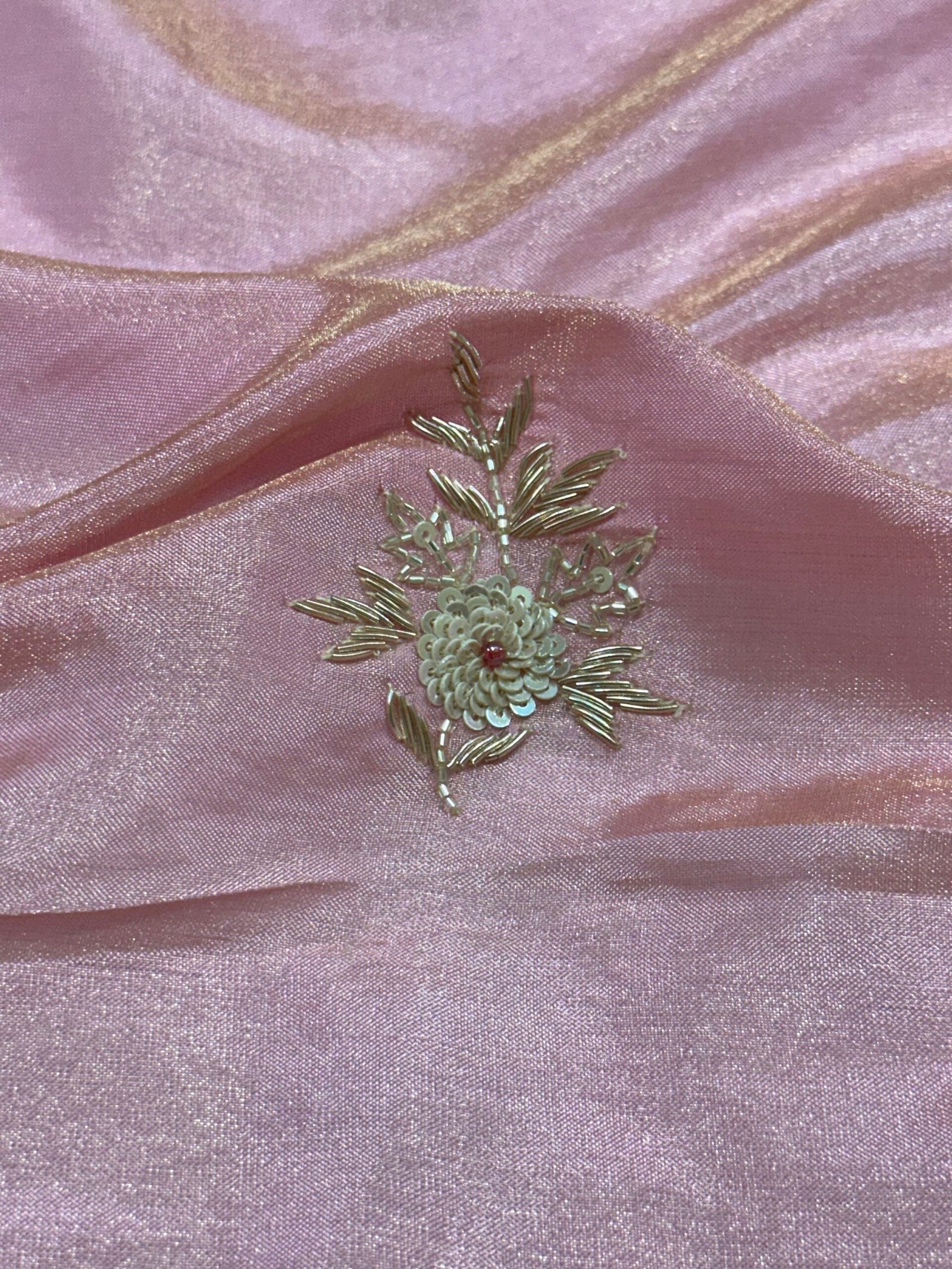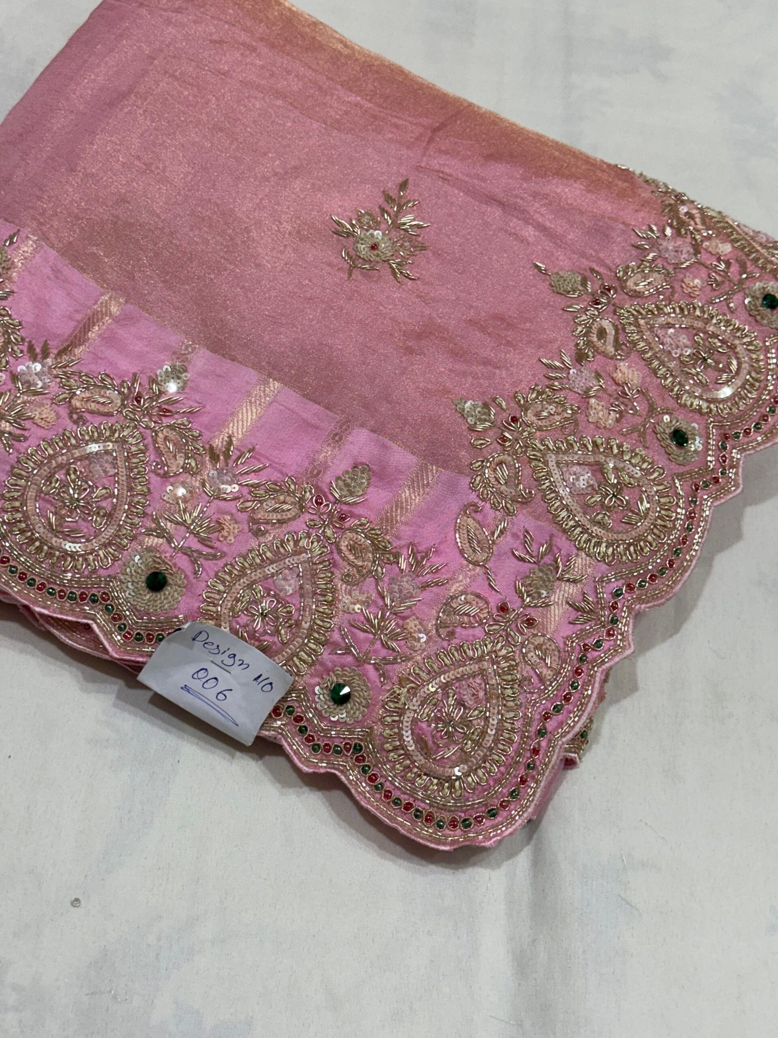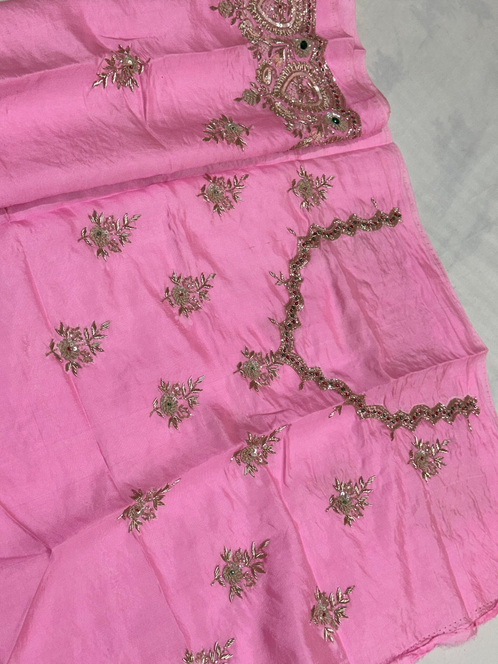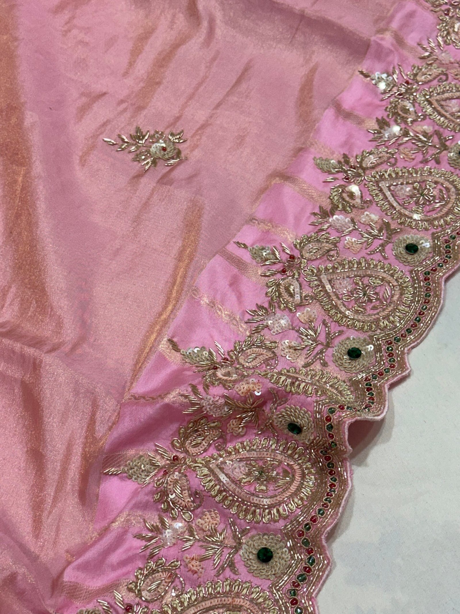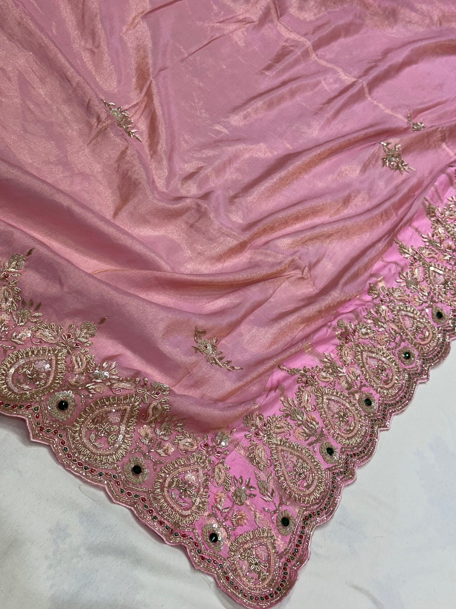 Each motif is carefully embroidered by skilled artisans, bringing traditional metallic detailing and timeless craftsmanship to life. The richness of the zardozi contrasts beautifully with the subtle pink base, creating a drape that feels both refined and celebratory.
