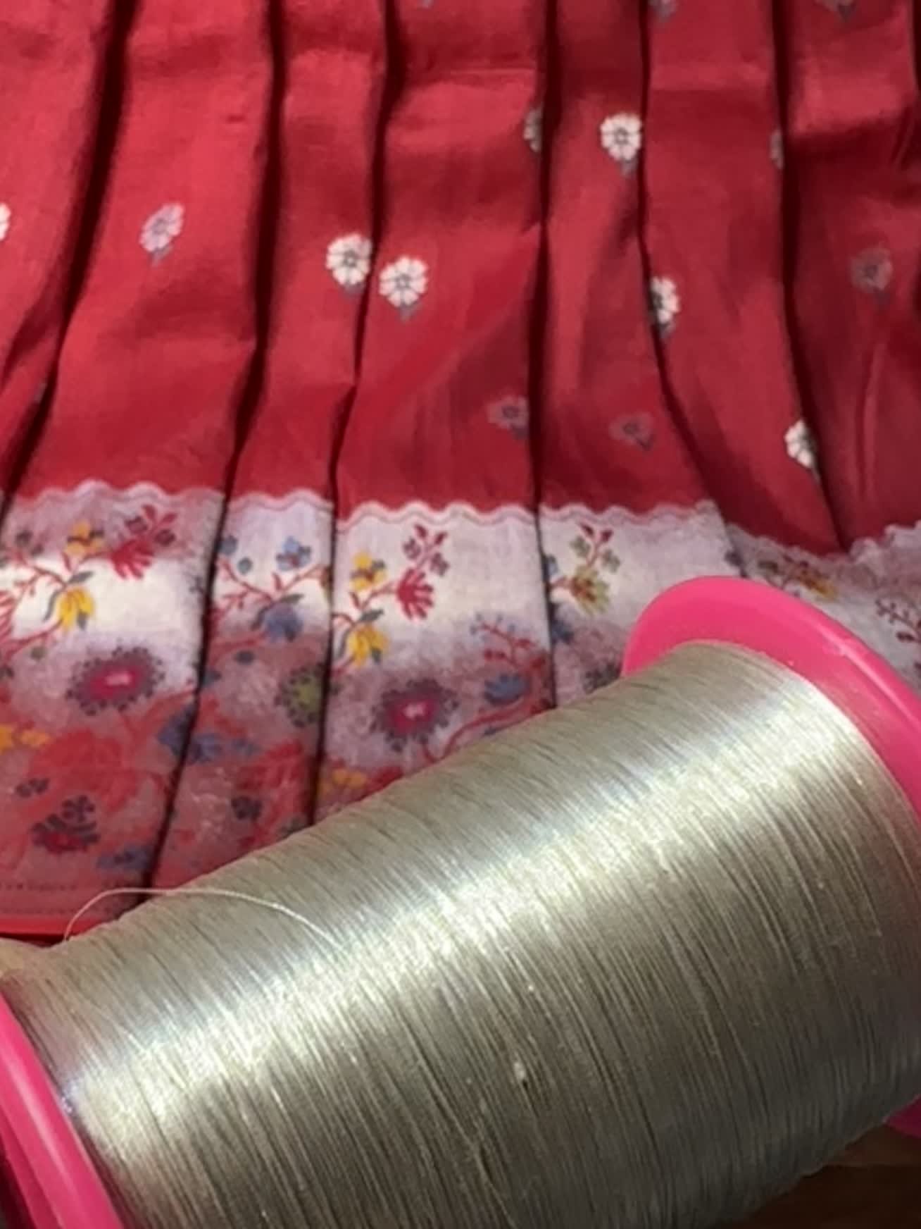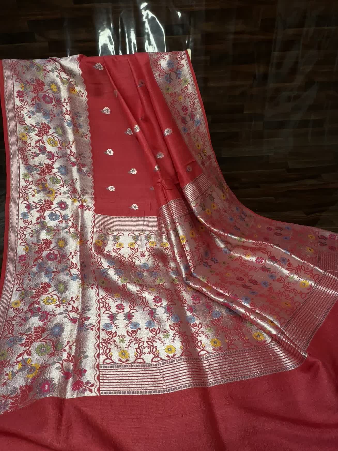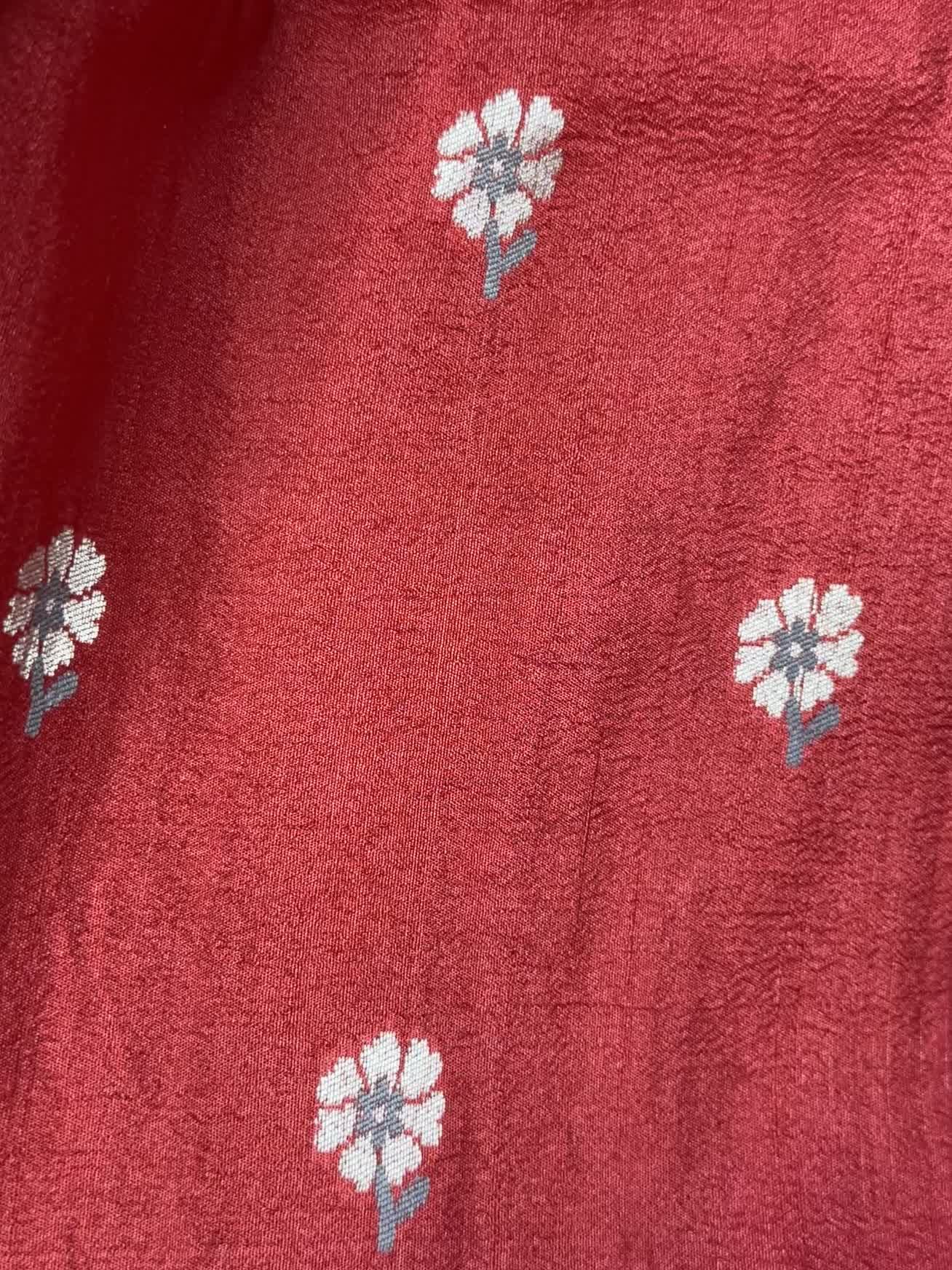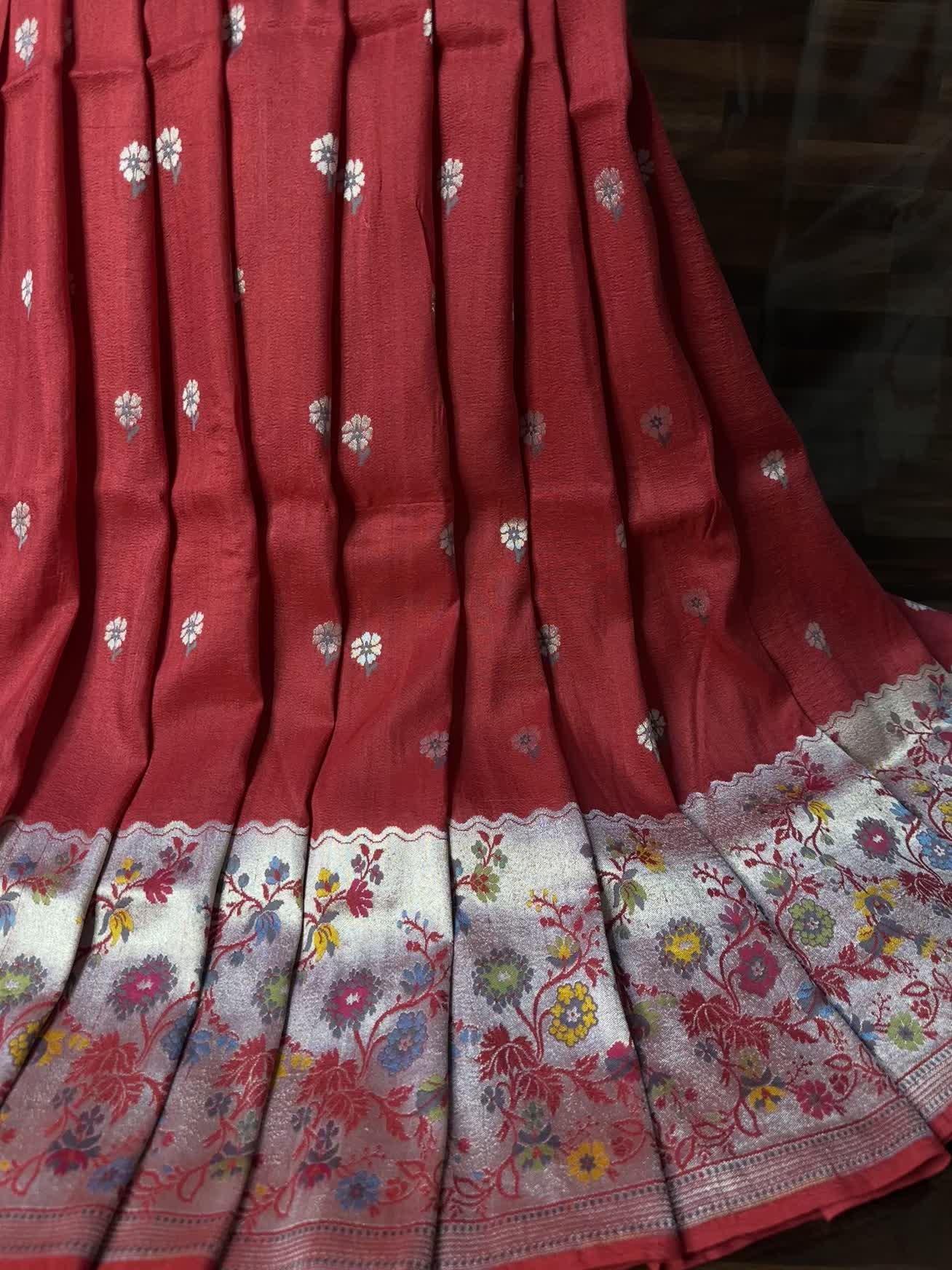 Woven by skilled artisans on traditional handlooms, the fabric carries the authentic character of Tussar silk—lightweight yet textured, with a refined rustic elegance. Subtle silver weaving enhances the richness of the red base, adding a graceful shimmer that catches the light without overpowering the natural beauty of the silk.