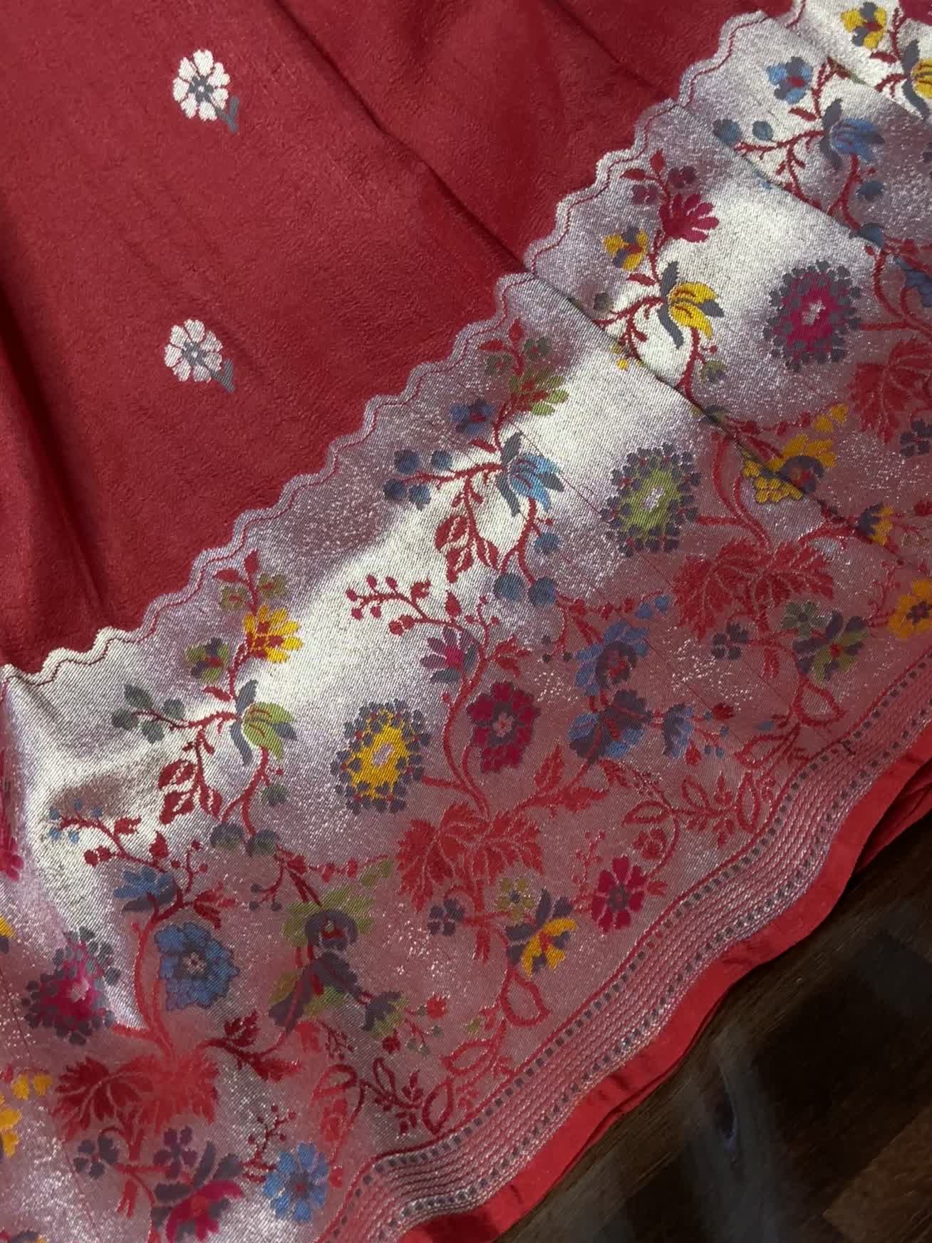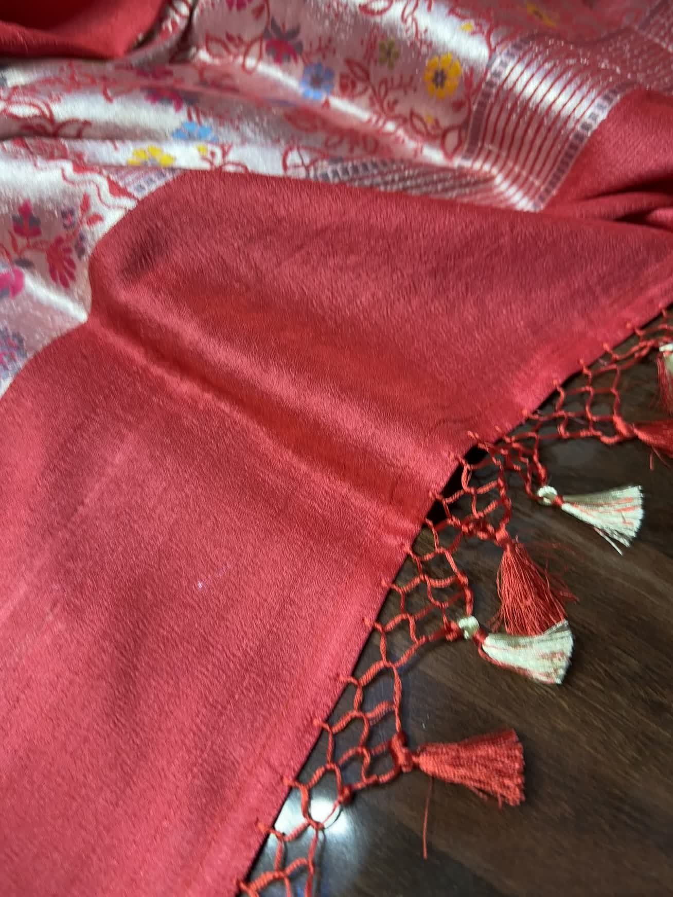 A timeless expression of handloom artistry, where the richness of red meets the elegance of pure Tussar silk.