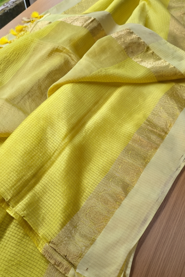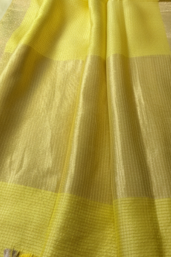 Meticulously handwoven, this saree features a subtle grid-like weave across its luminous yellow drape, highlighted by rich antique gold zari borders and pallu. The interplay of texture and sheen gives the fabric a resplendent depth, reflecting the House of Dharmani’s artistry in harmonizing tradition with understated luxury.