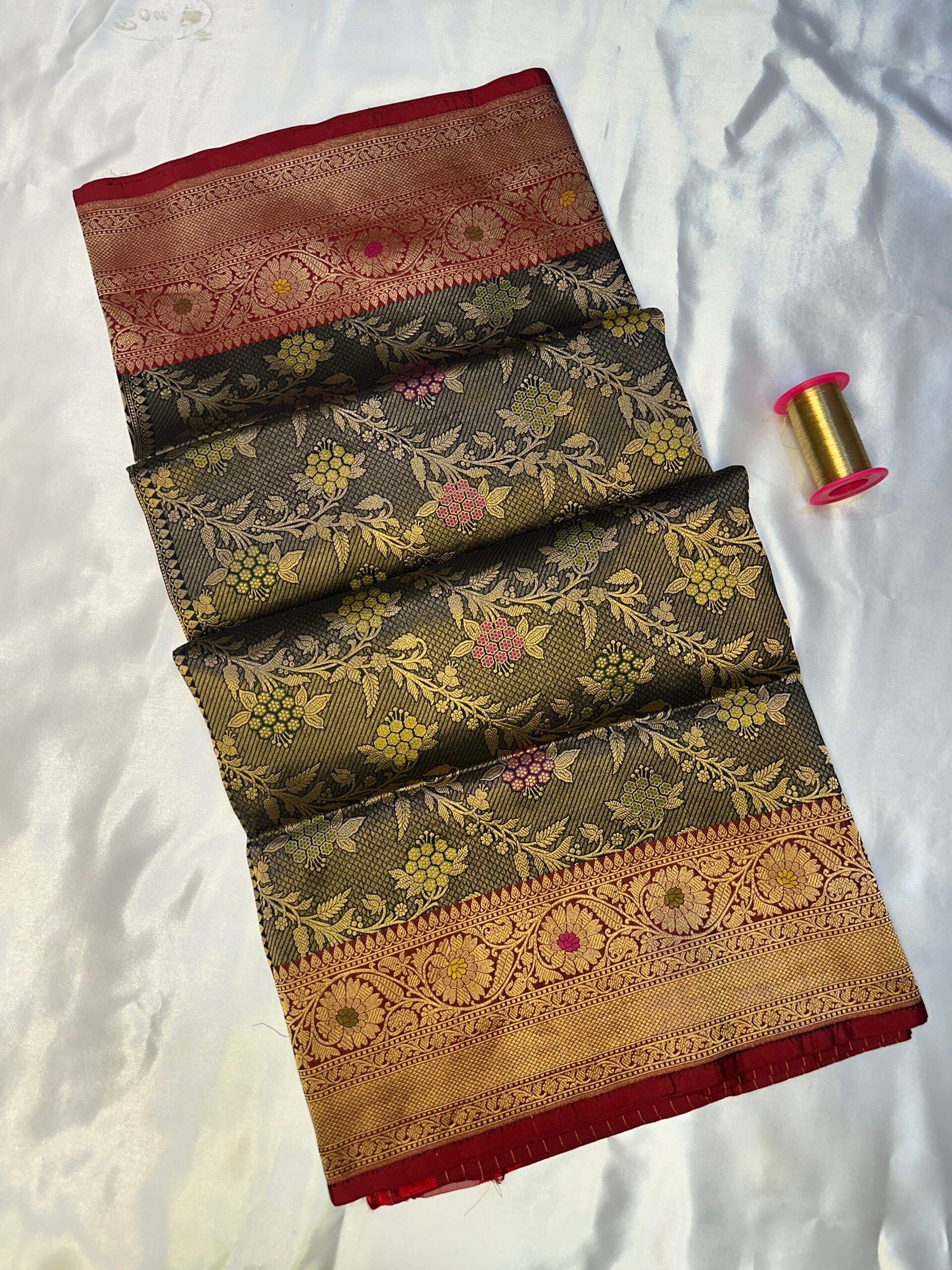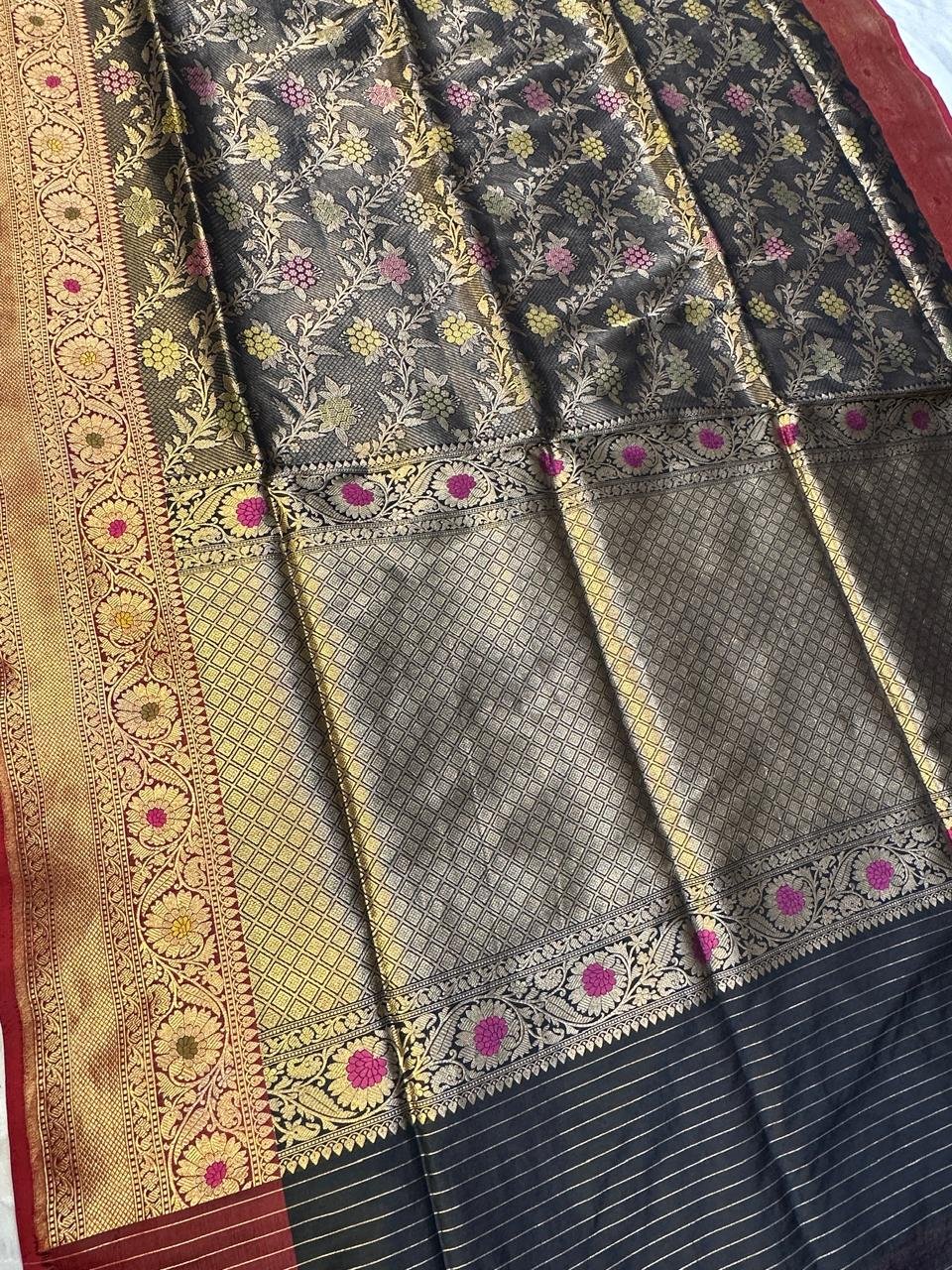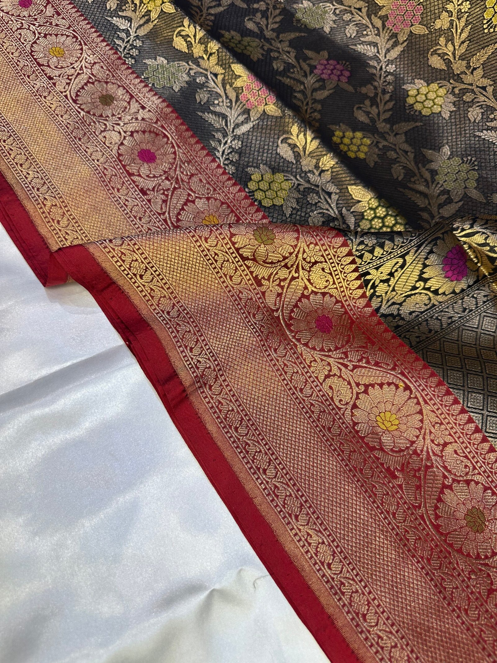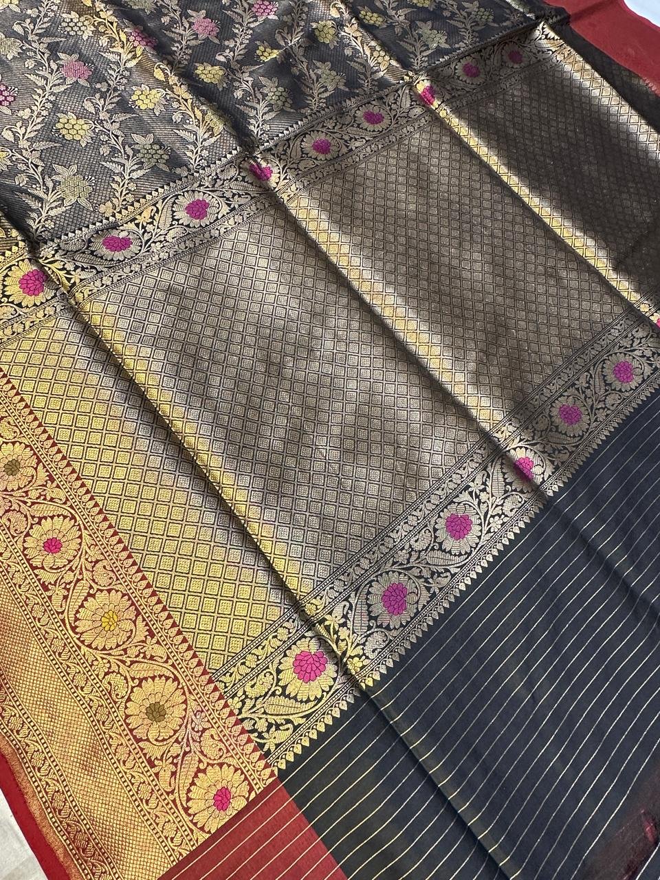 Elegant, intricate, and richly detailed, this saree is a refined expression of heritage craftsmanship. Set against a deep charcoal base, the design unfolds through an elaborate jaal of floral motifs, creating a dense yet graceful visual rhythm across the fabric.