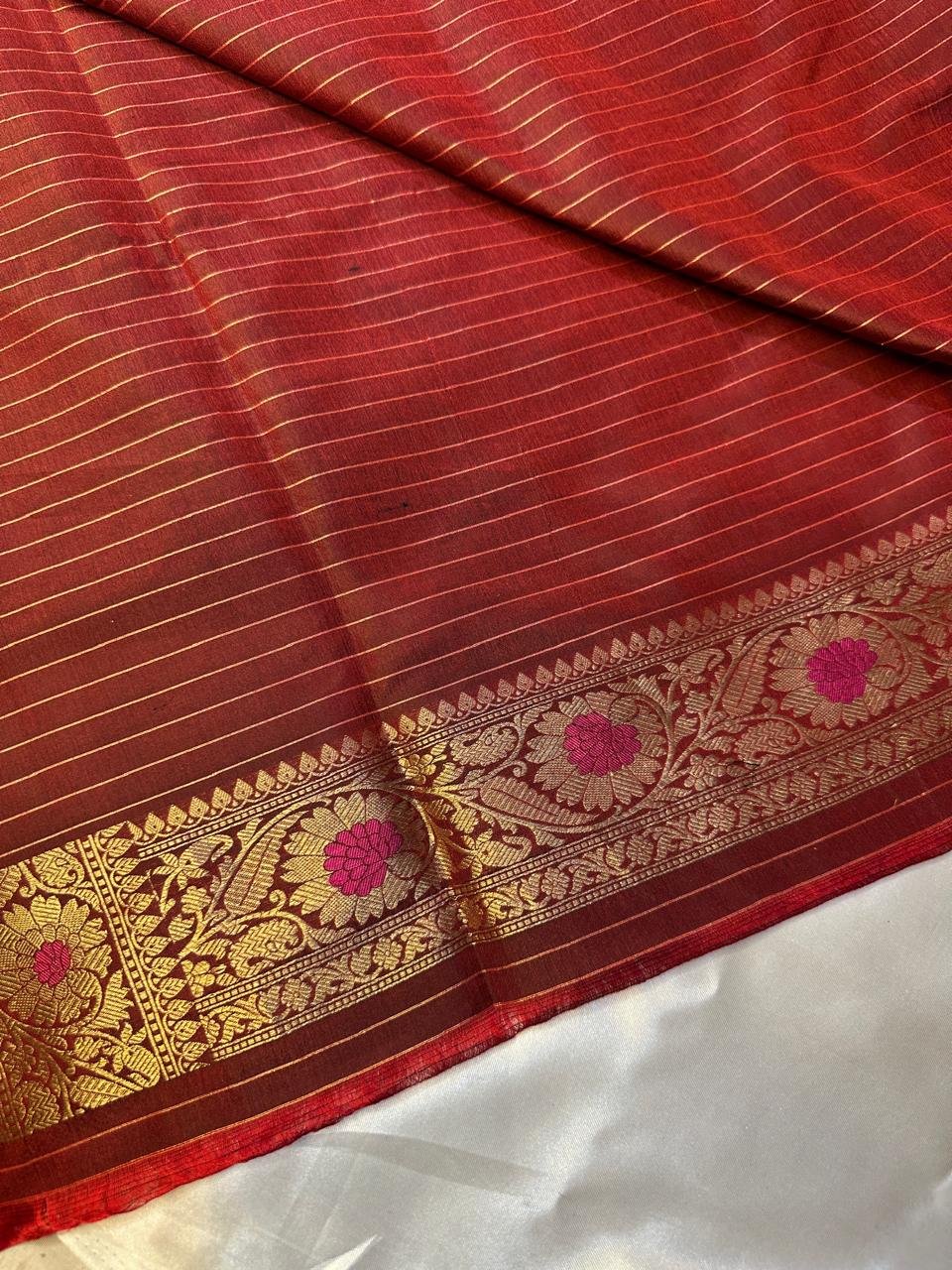 The beauty of the weave is elevated with delicate meenakari detailing in soft pink and subtle green, adding a touch of color that gently contrasts the richness of the gold zari. This interplay of tones brings depth and dimension, making the saree visually captivating without overwhelming its elegance.