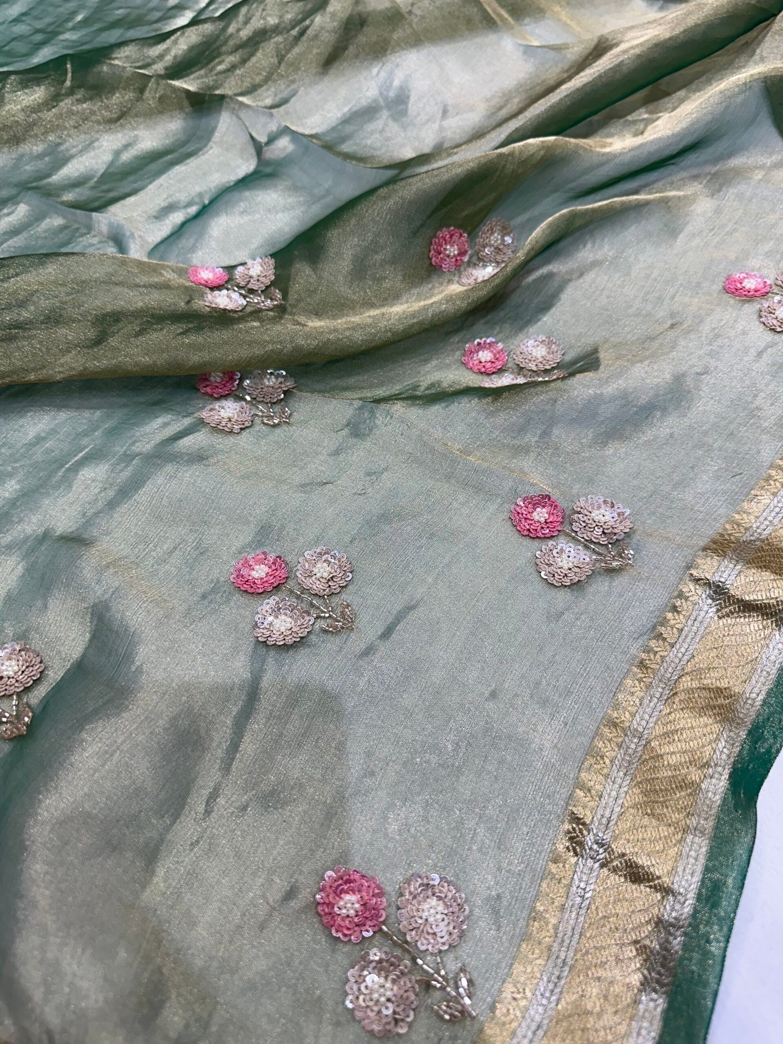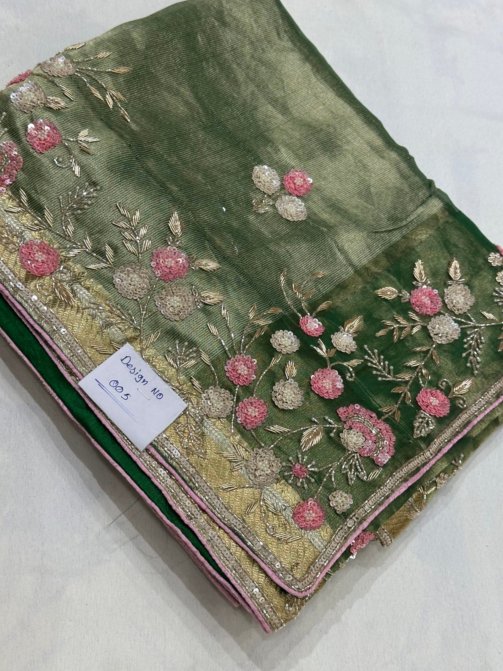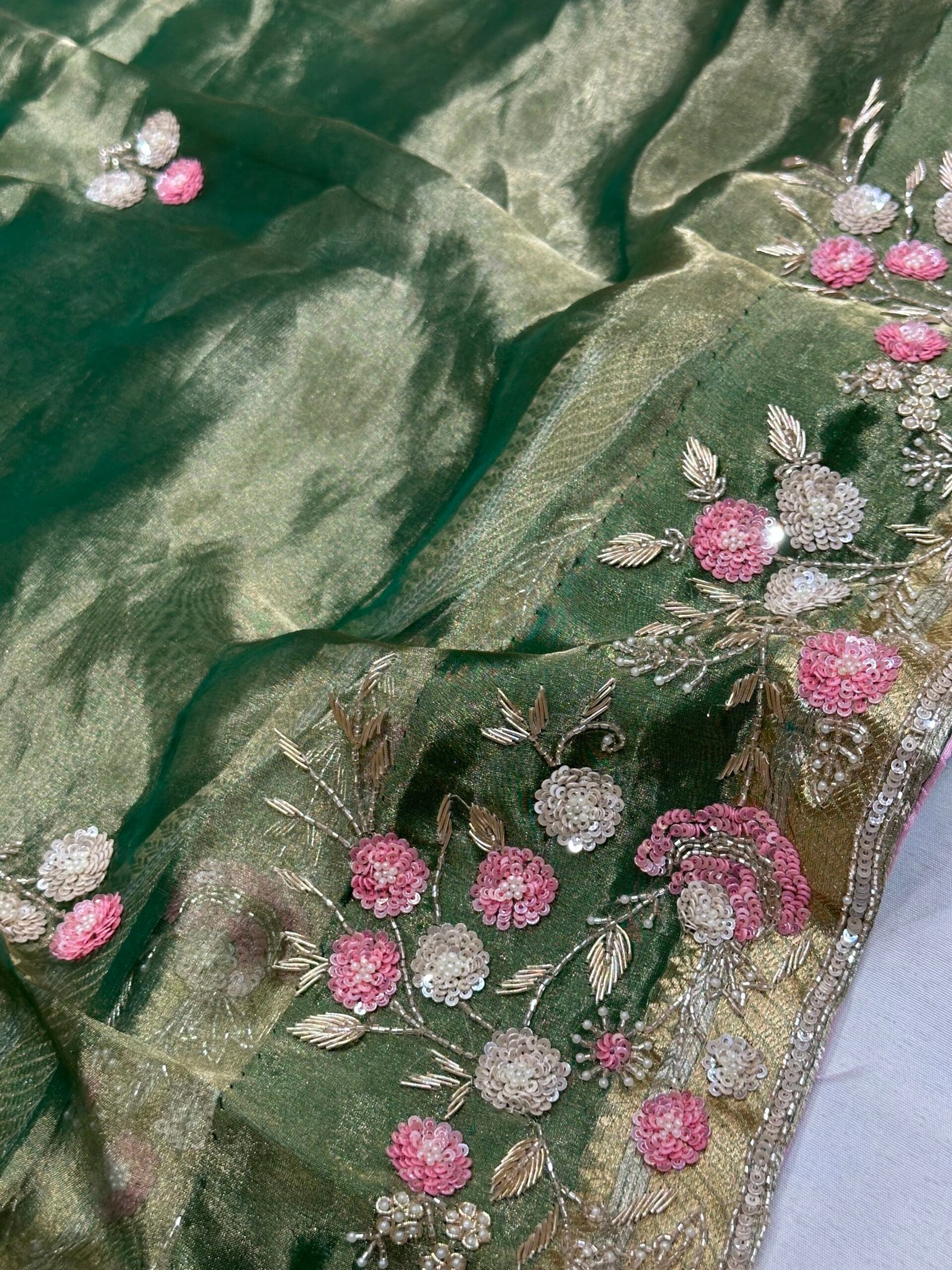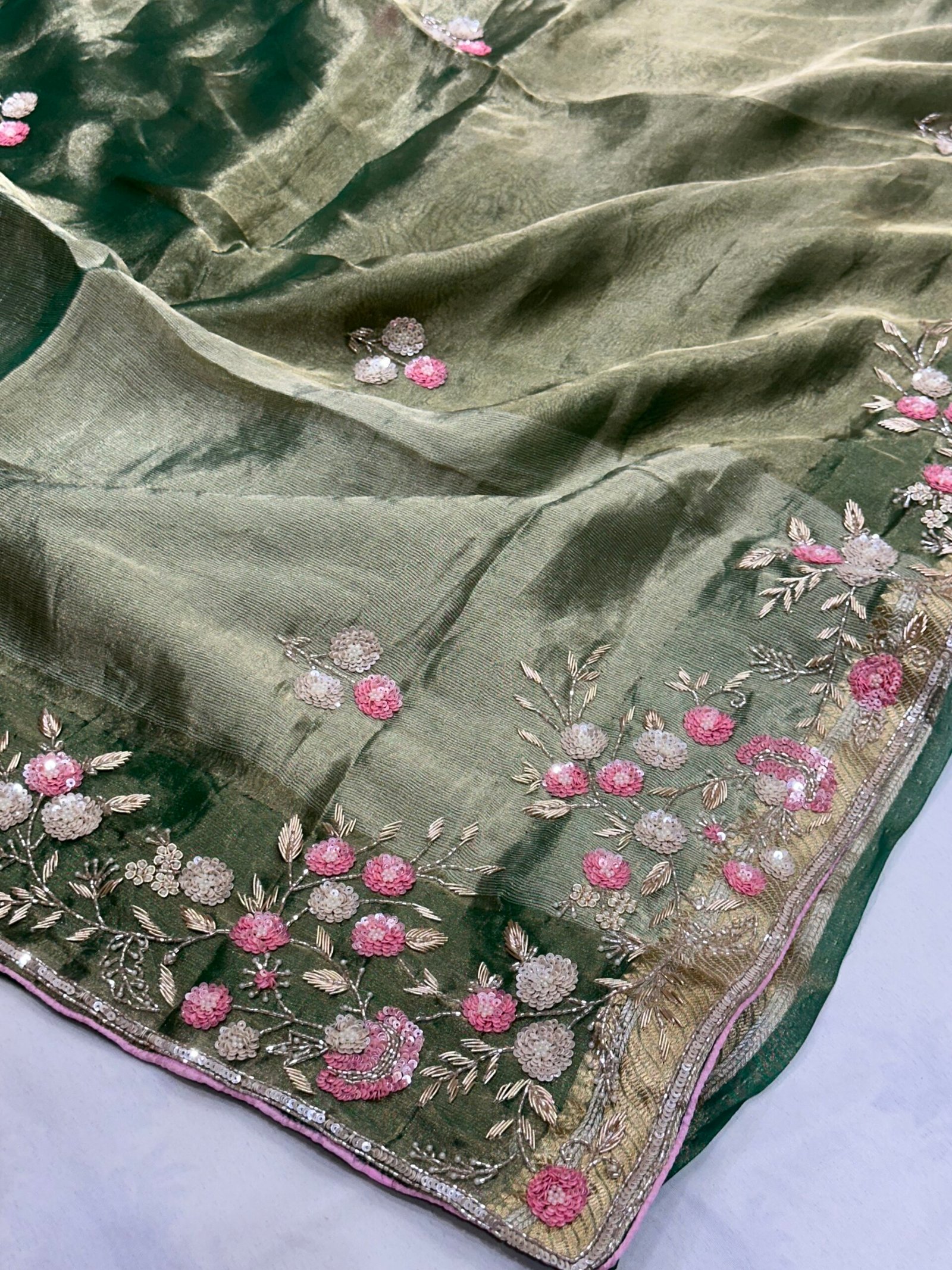 Dramatic, luminous, and unapologetically regal — this deep matcha green saree is crafted in pure metallic tissue that glows with a rich, dimensional sheen. The darker tone enhances the metallic finish, creating a striking interplay of depth and light with every movement.