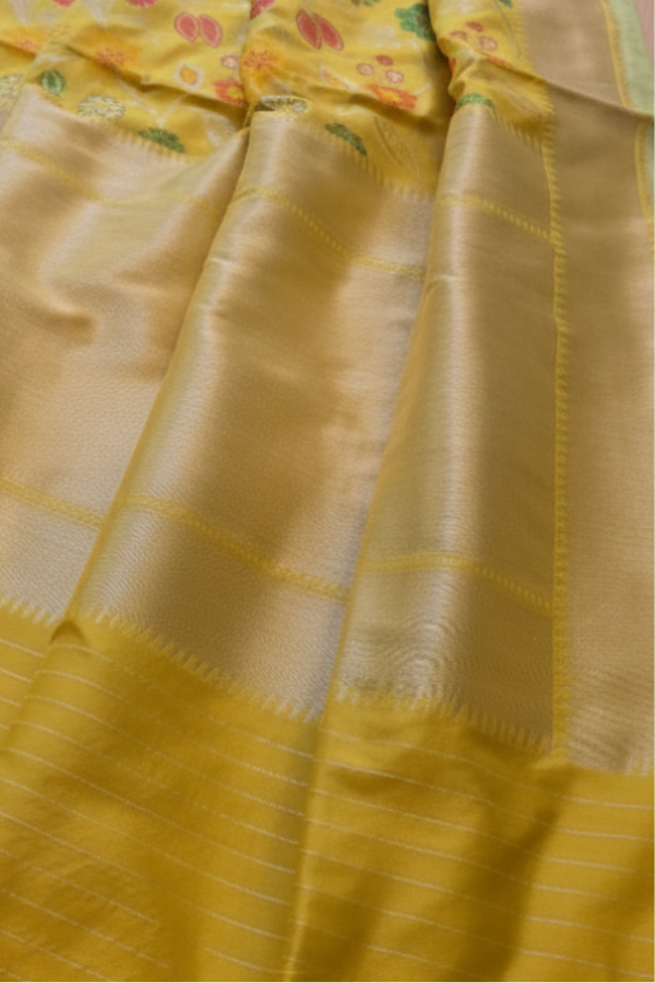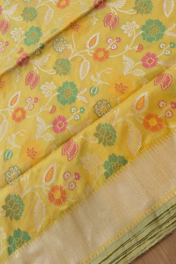 Handwoven with finesse, this saree features a bright yellow base adorned with scattered floral and leaf motifs in vibrant hues, evoking the charm of a blossoming garden. The golden zari border and pallu add a regal sheen, perfectly balancing festivity with elegance. A testament to the House of Dharmani’s craftsmanship, it captures the joy of tradition in every weave.