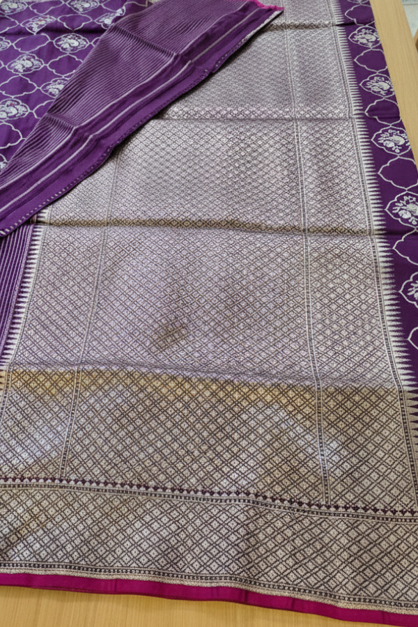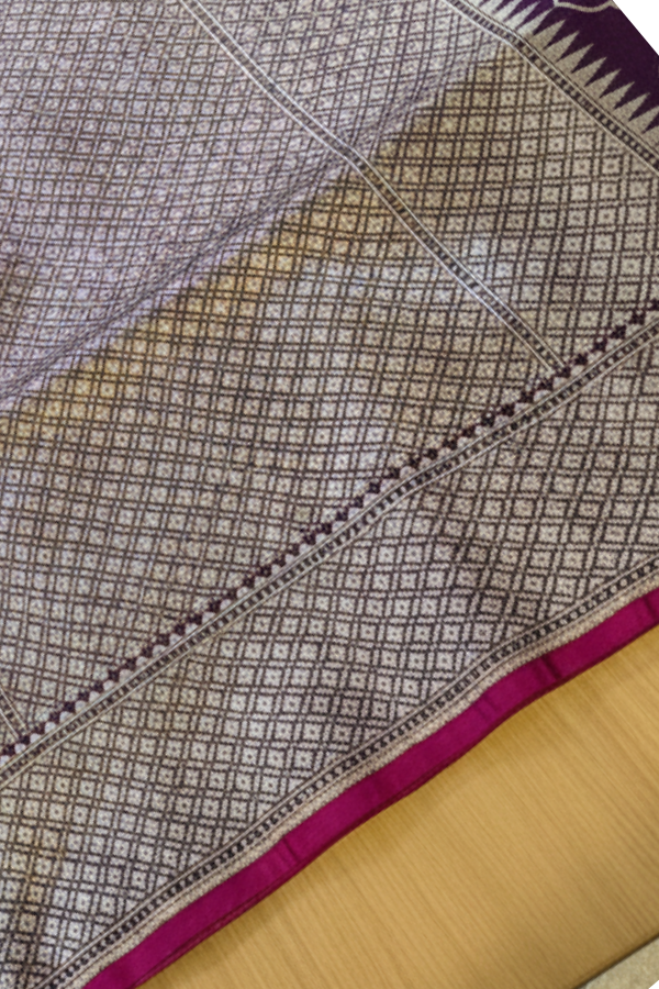 Expertly handwoven, the saree features a violet base with intricate silver zari floral jaal. The border and pallu are richly adorned with diamond-pattern zari weaving, creating a striking play of elegance and grandeur. True to the House of Dharmani’s craftsmanship, this piece embodies timeless regality with modern finesse.