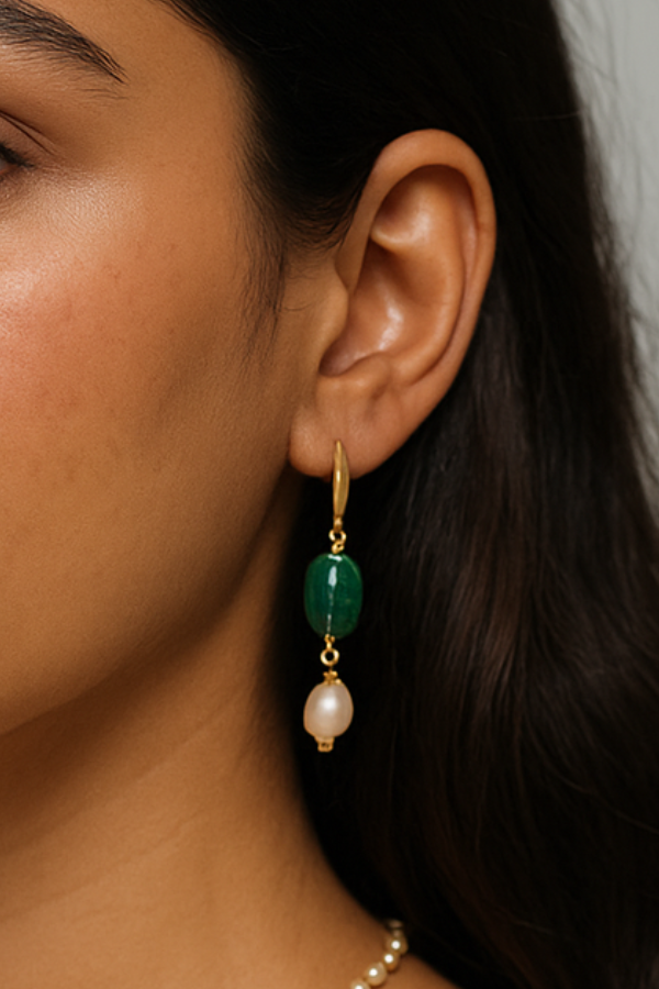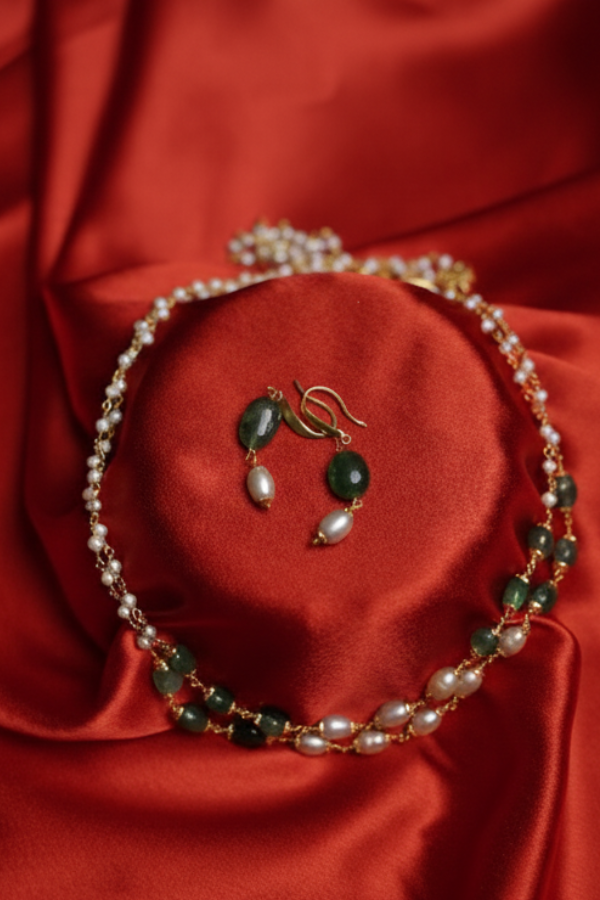 Handcrafted dual-strand mala featuring alternating pearls and emerald-toned beads, linked with precision wirework for a graceful drape