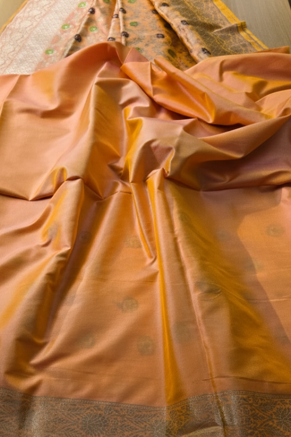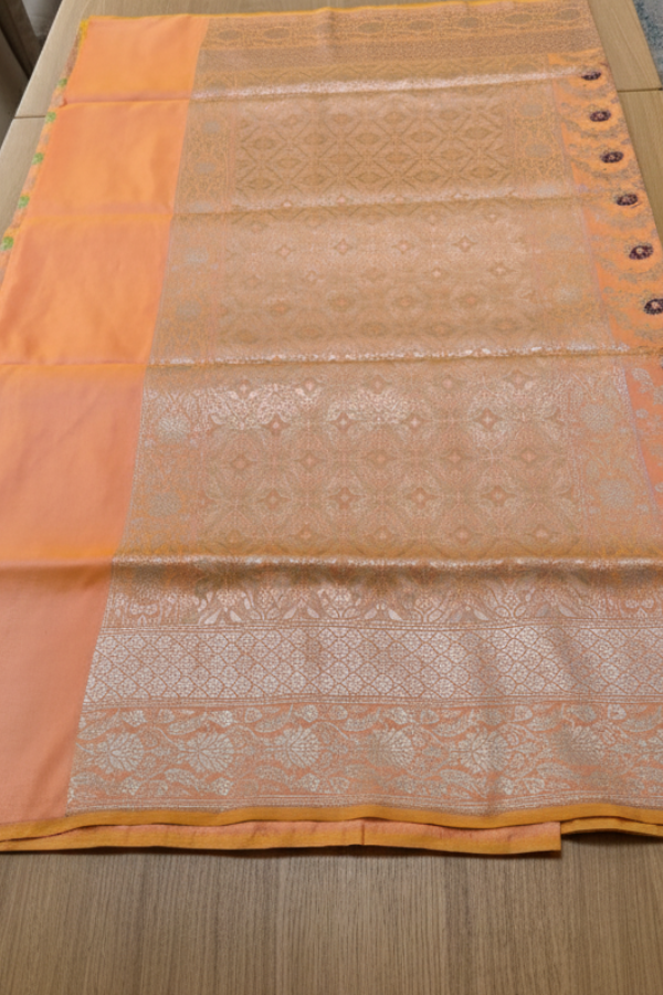 Handwoven with traditional mastery, this saree brings alive an apricot-orange base shimmering with silver zari jaal, where every vine unfurls into blossoms of deep purple and lively green. The intricate weaving echoes age-old artistry while balancing vibrancy with refinement, a testament to the House of Dharmani’s dedication to timeless weaves.